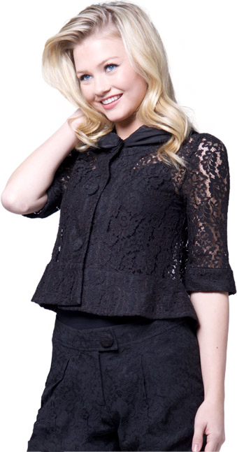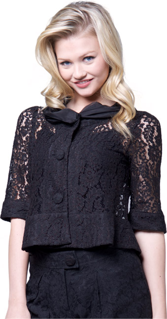 Black lace peplum jacket with organza collar and self-covered buttons. Lined at cuff and peplum. 23" long from center back. Rayon outer. Silk lining. Dry clean.