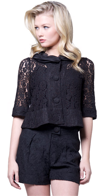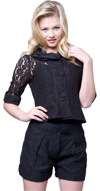 Black lace pleated shorts are a staple for 2013. Inseam 4". Lined. Polyester with silk lining. Dry clean. Suggested retail: $149