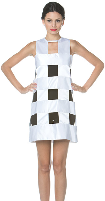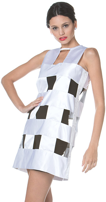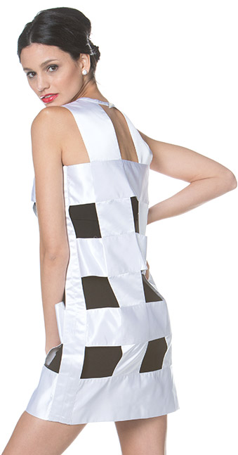 White silk satin cage dress with black romper jersey liner. Self lined.