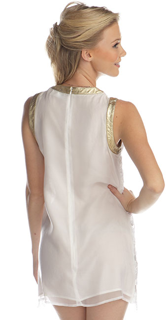 White embroidered lace mini with gold leather trim. Silk organza back with 22" zipper. Silk lining. 32" length.