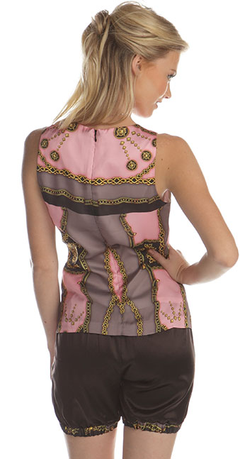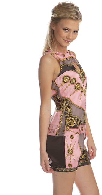 Pink/black/gold print top with circle cutout. 24". Silk. Zipper at back.