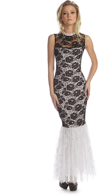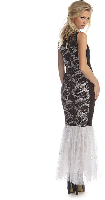Black Chantilly lace over white stretch satin. French tulle crystal embellished and embroidered Mermaid skirt.