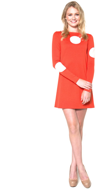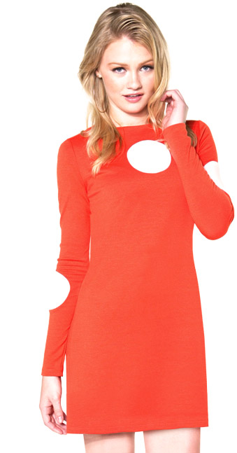 Orange A-line mini dress with 3 white circle inserts, one at center front, one on each arm. 32½" length. Ponte. 86% polyester, 12% rayon and 2% spandex. Dry clean.