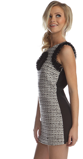 Black/white cotton tweed mini shift dress with lace at circle cutout and armholes. Black silk charmeuse back.