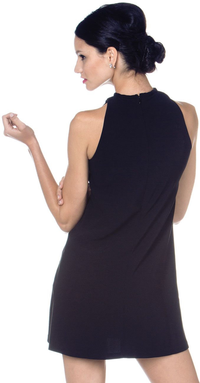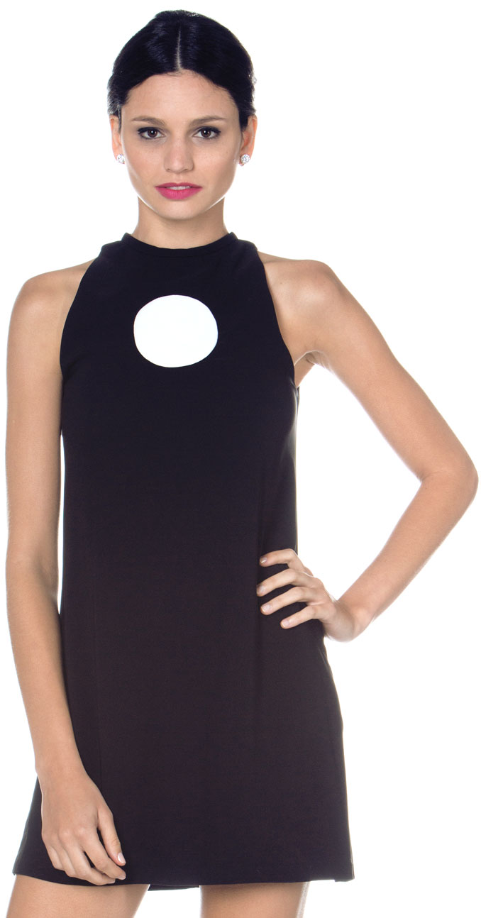 The bold white cut-out circle adds a simple '70s vibe to this shift dress. From white sneakers to boots, your day in to night options are endless! Black lightweight crepe. Lined. Polyester. 33" length.