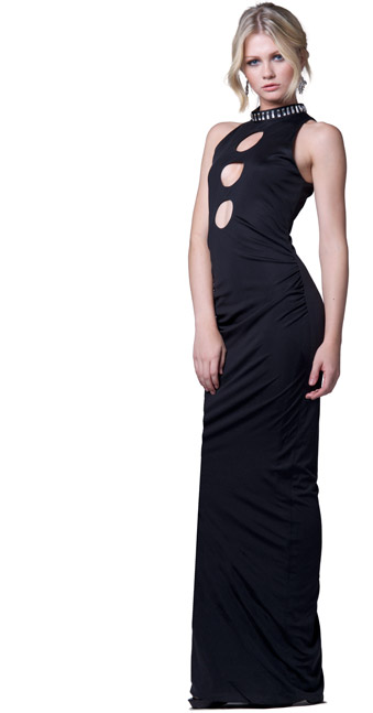Black silk jersey gown featuring cutout 3" circles. Rectangular crystals at collar. Rear zip. 100% silk. Lined. Dry clean.