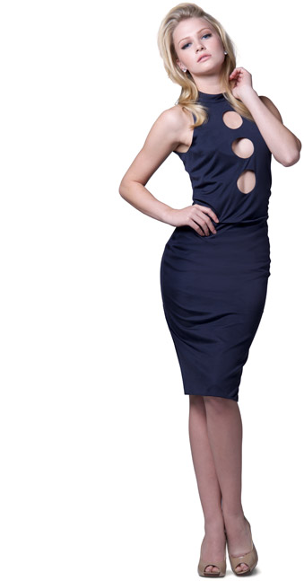 You're sure to be a hit in this navy jersey shift dress. Three 3" circle cut-outs are reminise of those geometric prints from the '60s, but with a twist! 100% silk. Lined. 42" length.