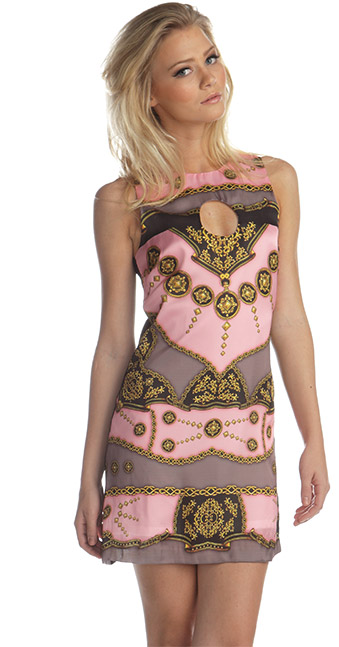 Pink/black/gold print shift dress with circle cutout. Black bamboo stretch back. Lined. Silk. 33".