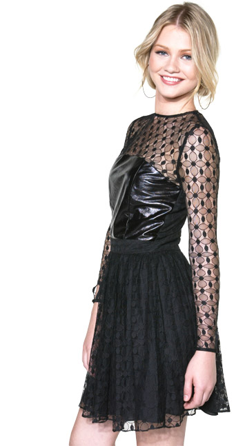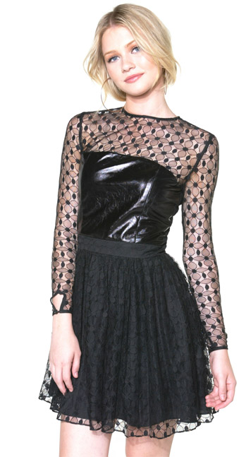 Black lace dress with black leather bodice. Long sleeve. 33” long. Polyester lace / geniune leather. Silk lining. Dry clean.
